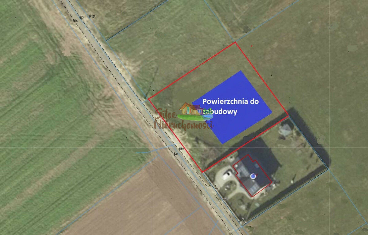 Na jednym ze zdjęć zaznaczone jest przybliżone miejsce umiejscowienia na działce budynku, z uwagi na uwarunkowania prawne oraz strefę związaną ze służebnością przesyłu gazu.